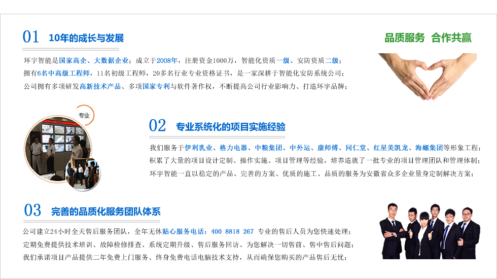 合肥市環(huán)宇智能工程有限公司成立于2008年,科創(chuàng)版上市企業(yè),現(xiàn)注冊資金1000萬元整,電子與智能化系統(tǒng)集成資質(zhì)壹級,安防資質(zhì)貳級,是“國家高新技術(shù)企業(yè)”、“合肥市高新技術(shù)產(chǎn)品認定企業(yè)”、“安徽省安防協(xié)會會員單位”、“AAA級信用等級認證企業(yè)”、“AAA級重合同守信用企業(yè)”、“合肥市創(chuàng)新型企業(yè)”、是行業(yè)領(lǐng)先的智能化整體解決方案的集成商。